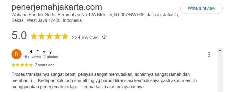 Kepercayaan itu juga terbukti dari review di Google Business kami. Silakan cek langsung profil penerjemahjakarta.com di Google untuk melihat puluhan testimoni asli dari klien-klien yang telah berhasil.