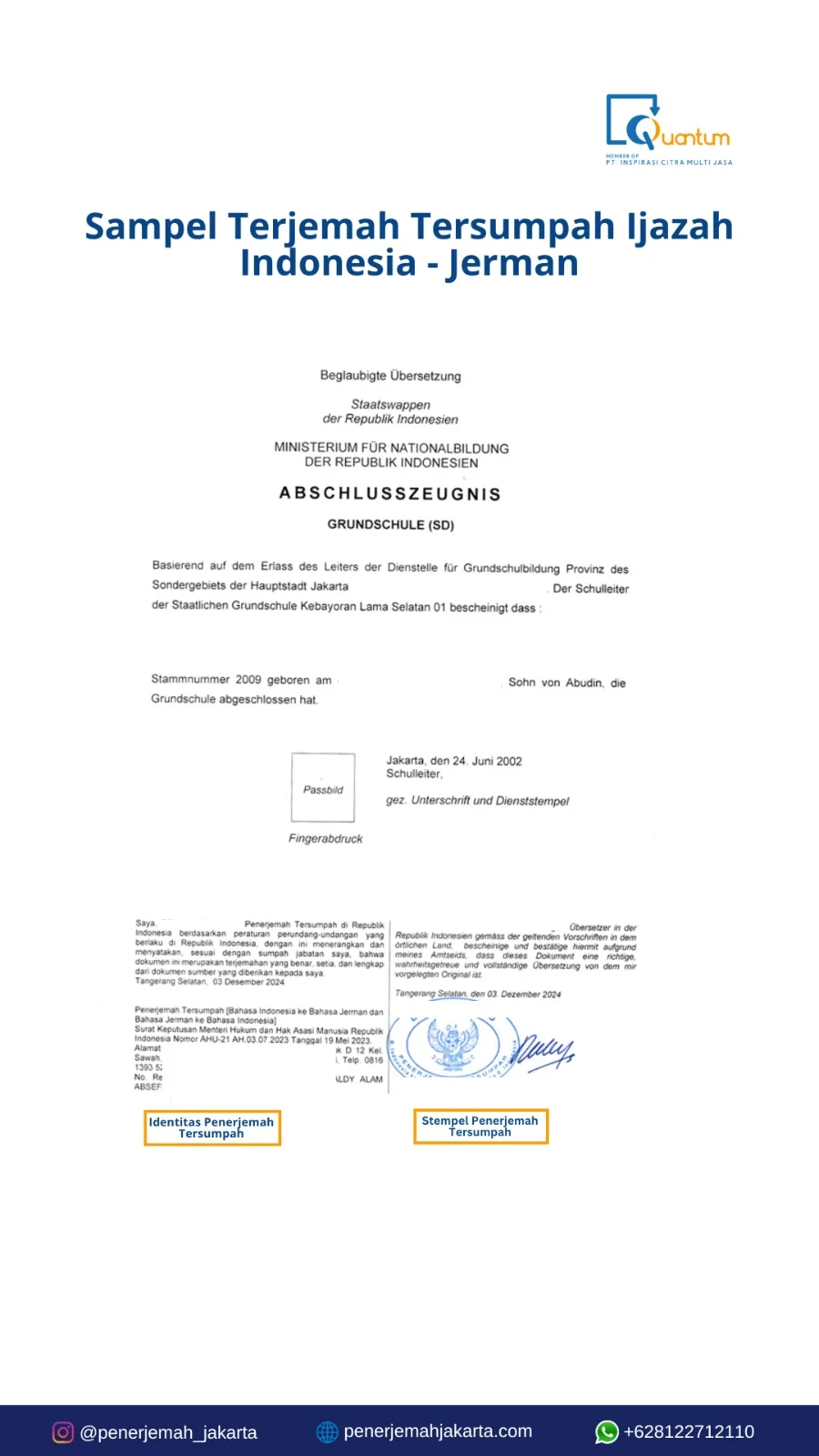 Terjemahan tersumpah Bahasa Jerman merupakan layanan penerjemahan resmi yang diakui secara hukum baik di Indonesia maupun di negara-negara berbahasa Jerman. Dokumen yang telah melalui proses penerjemahan tersumpah memiliki kekuatan hukum yang setara dengan dokumen asli dan dapat digunakan untuk berbagai keperluan formal seperti proses imigrasi, pendaftaran pendidikan tinggi, transaksi bisnis internasional, serta pengurusan dokumen legal lainnya. Keakuratan terminologi, kesesuaian format, dan kepatuhan terhadap standar hukum menjadi prioritas utama dalam setiap terjemahan yang kami hasilkan.
