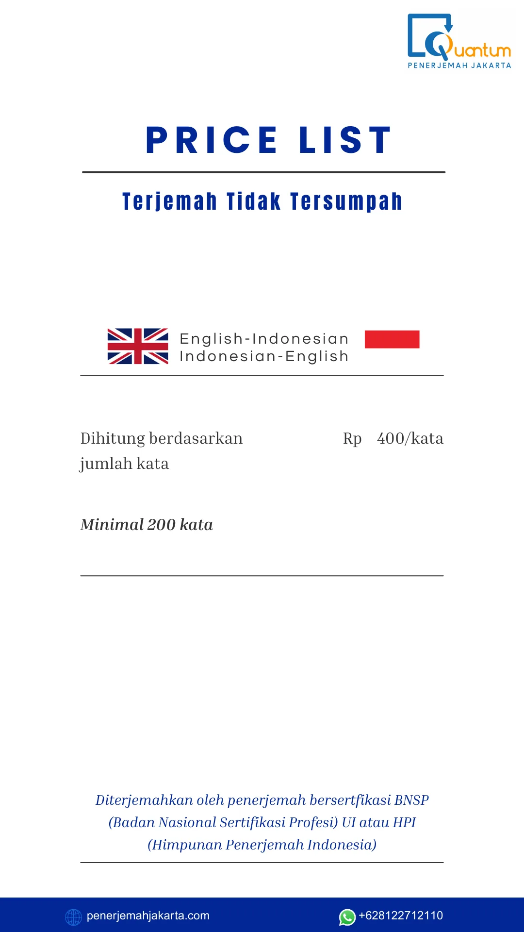 Jumlah Kata Dokumen Anda × Rp 400 = Perkiraan Biaya